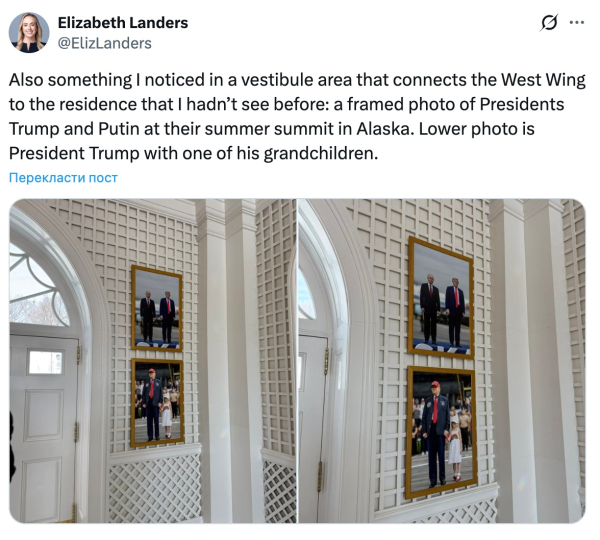 In the United States, which is negotiating with Russia over the war in Ukraine, a new photo has appeared in one of the corridors of the White House. This is stated in a publication by journalist Elizabeth Landers on the social network X.
