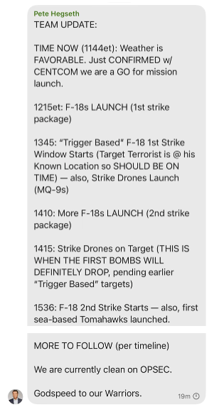 On March 15, the day of the offensive, Deputy Defense Secretary Pete Hegseth circulated an exhaustive timetable of the impending bombardments. The messages incorporated the deployment of F-18 fighter jets, the commencement of MQ-9 drone offensives, Tomahawk missile attacks, and a note on operational security: “We are OPSEC-cleared.” This was all perceived by an external observer, journalist Goldberg, who was not associated with the endeavor.